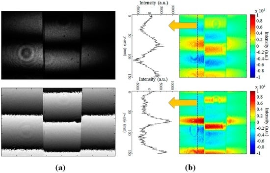 In our depth reconstruction, the fictitious scanning pattern is generated through multiple spatial frequencies of the interference fringes for the 3D depth reconstruction using the geometrical optical parameters [21,27]. In Figure 12b, the upper and the lower images show the fictitious scanning patterns generated from the two spatial frequencies of Δg = 200 and 800 µm and generated from full sets of four spatial frequencies (Δg = 200, 400, 600, and 800 µm), respectively. Compared with the upper image, the fictitious scanning pattern shown in the lower image can make much sharper peaks owing to more sinusoidal sets of the spatial frequencies used in the synthesis of the fictitious scanning pattern [21,27]. This could result in the enhanced depth resolution and precision after the 3D depth reconstruction.
