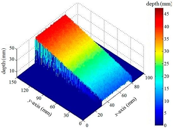 Figure 13 shows the 3D depth profile reconstructed from the slanted object using the 16 sets of the dynamic fringe patterns. Compared with conventional phase unwrapping methods [28], one of the merits of the depth reconstruction based on the geometrical optical parameters used in our experiment is that the absolute depth values together with the 2D positional values, not just the relative phase values, can be obtained, as shown in Figure 13.