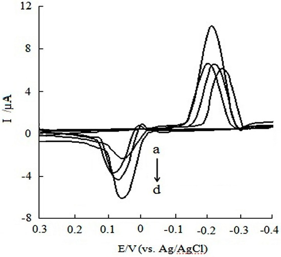 Several supporting electrolytes such as 0.10 mol/L potassium hydrogen phosphate-potassium dihydrogen phosphate buffer (Figure 5a), 0.10 mol/L phosphate buffer solutions (PBS, 7% Na2HPO4 + 1% KH2PO4 + 90% NaCl + 2% KCl) (Figure 5b), 0.10 mol/L citric acid buffer (Figure 5c), and 0.10 mol/L acetic acid-sodium acetate buffer (Figure 5d) were tested at MWCNTs/SPE. A pair of CV redox peaks are observed in the four supporting electrolytes. A better-defined CV response with higher redox peak of CGA than in the other cases was obtained in 0.10 mol/L acetic acid-sodium acetate buffer.