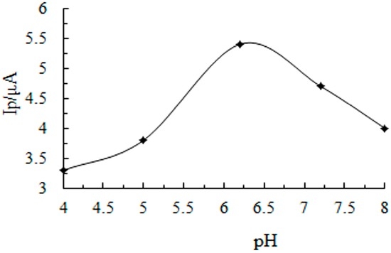 The influence of pH was investigated in 0.10 mol/L acetic acid-sodium acetate buffer, as shown in Figure 6, the oxidation peak current of CGA increases with the increasing of pH from 4.0 to 6.2, and then reaches its maximum at pH 6.2, while the oxidation peak current decreases as pH increases above 6.2. Therefore, 0.10 mol/L acetic acid-sodium acetate buffer (pH 6.2) was chosen as the optimal supporting electrolyte for subsequent experiments.