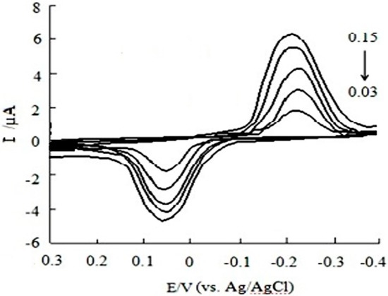Figure 7 and Figure 8 shows the effect of scan rate on the CV response of CGA at MWCNTs/SPE in the 0.10 mol/L acetic acid-sodium acetate buffer solution (pH 6.2). It is found that both the oxidation peak current (Ipa) and reduction peak current (Ipc) are linear to the scan rate (υ) in the range of 0.03 to 0.15 V/s, the linear regression equations of Ipa and Ipc are Ipa (µA) = 15.887 ν + 2.8809 (r = 0.9969) and Ipc (µA) = 16.798 ν + 4.1028 (r = 0.9955), respectively. This indicates that the Ip is proportional to the v but not v1/2. Therefore, the electrochemical process of CGA at MWCNTs/SPE is adsorption-controlled. The maximum peak signal-to-noise ratio for CGA was achieved at the scan rate of 0.15 V/s. The scan rate of 0.15 V/s was therefore selected for this work.
