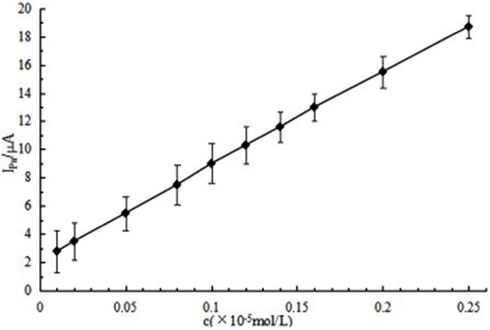 A well-defined oxidation peak DPV responses with a high peak current of CGA was observed at MWCNTs/SPE. MWCNTs/SPE was the working electrode. The different concentrations of CGA were added into acetic acid-sodium acetate buffer solution (pH 6.2), then the differential pulse voltammetry analysis was used in a pulse width of 50 ms, a pulse amplitude of 180 mV, and pulse interval of 50 ms in the potential range of −0.5–0.5 V. We found that the oxidation peak current value was linearly related to the concentration of CGA in the range of 0.17 to 15.8 μg/mL and the detection limit was 0.12 μg/mL (shown in Figure 9). The regression equation was: Ipa (µA) = 4.1993 c (10−5 mol/L) + 1.1039 (r = 0.9976).