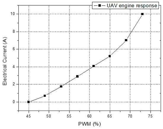 Figure 1 shows the detailed relationship between the duty cycle of the PWM signals and the electrical current demanded by a single engine of the UAV, measured by a conventional clamp ammeter. The UAV engine demands more electrical current in high duty cycles, thus its response is not linear throughout the entire operation range and it reaches its rotation speed limit when the PWM signal has a duty cycle of 73%, which corresponds to 10 A.