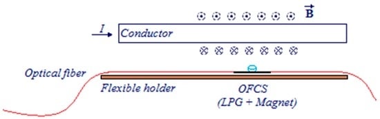 Optical current sensors using optical fibers have been investigated since the 1960s [14,15]. Since then, several researchers have proposed and demonstrated a number of practical applications using optical fiber current sensors (OFCS) [16,17,18]. One of the most popular configurations for current measurements is based on the magneto-optic effect, known as the Faraday rotation effect. For example, in [16] the authors reported an OFCS based on the Faraday effect for the measurement of plasma current in tokamaks. In [17] a long-period fiber grating (LPFG) and a Faraday effect sensing element to measure electrical current in transmission lines are described, whereas in [18], the authors have proposed the use of the Faraday rotation effect using a LPFG inscribed on a polarization-maintaining fiber as a sensor demodulator. However, these methods are affected by the fiber birefringence [5] and limited by the small Verdet constant of silica, which requires a very long fiber to enhance the sensitivity [19].