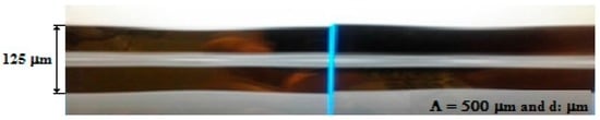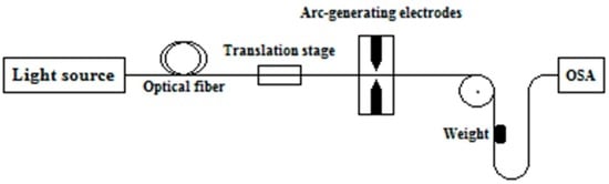 An LPFG sensor was fabricated in the Laboratory of Instrumentation and Telemetry (LITel) at Federal University of Juiz de Fora (UFJF). Figure 4 shows the fabrication scheme of the LPFG sensors. It was manufactured in a single-mode optical fiber (SMF28) using the electric arc discharges method [25,35]. The fiber was arc-induced using a fusion splicer (KL-300T, Jilong, Nanjing, China) with electrical arc discharges of 20 bits and 470 ms, grating period of Λ = 500 µm and constant external tension of 2 g weight [28]. During the fabrication process, an optical spectrum analyzer was used to monitor the transmission spectrum characteristics. Further, these fabrication parameters were chosen in order to achieve coupling of the highest possible cladding mode near λ = 1550 nm, which would provide higher sensitivity to external parameters sensing [30,31]. The LPFG sensor microphotograph after the manufacturing process is shown in Figure 5. There is a periodical diameter reduction and elongation of the fiber, which, actually, were introduced by the tapering geometric deformation after the arc discharges [36].