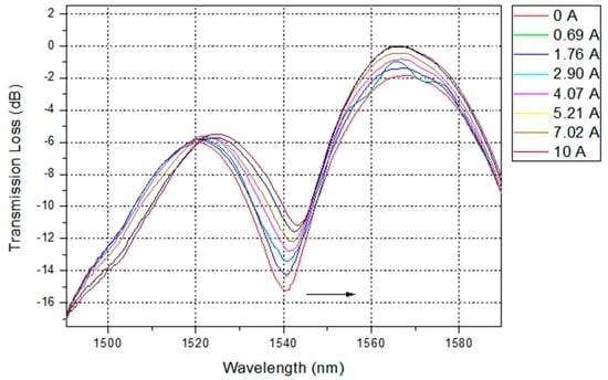 The response of the current sensor was experimentally investigated by applying PWM duty cycles in the range from 45% to 73%, which corresponds to an electrical current of 0–10 A supplied to a single UAV motor, as shown in Figure 1. We measured and recorded the transmission spectrum of the LPFG sensor during the process of the experiment, and it presented a significant change in the transmission, due to the electrical current variation, as shown in Figure 6.