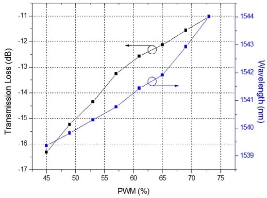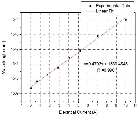 The attenuation band shifted from 1539.36 nm to 1544.02 nm, with a spectral variation shift of 4.66 nm. In addition, the dip of the transmission loss shifted from −16.32 dB to −11.03 dB, varying 5.29 dB. We can see the detailed response curves of the LPFG for the PWM signals in Figure 7, and its corresponding wavelength and intensity responses for electrical current in Figure 8 and Figure 9, respectively. In Figure 7, we observe that the response for PWM duty cycle signals presents the same behavior as the electrical current variation, because of their correlation, as shown in Figure 1. As the electrical current demanded by the UAV engine increased, the dip wavelength shifted towards higher wavelengths. By data fitting, the sensitivity of 0.4703 nm/A was achieved with high degree of electrical current linearity, confirmed by the R2 coefficient derived from the fitting process, as seen in Figure 8.