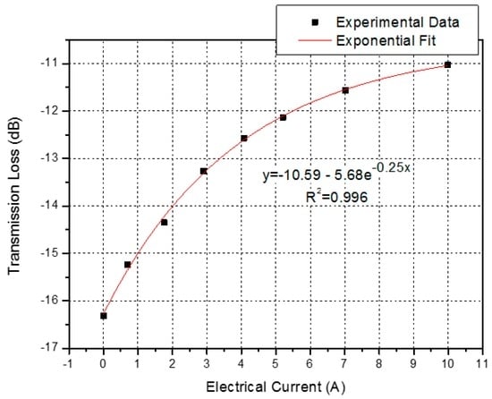 On the other hand, Figure 9 shows the transmission loss decreasing as the electrical current increases. Furthermore, this intensity changes behavior can be fitted well by an exponential function with a R2 coefficient value of 0.996 over the sensing range. The exponential curve in Figure 9 can be used to calibrate the nonlinearity between the transmission loss and the electrical current variation for the OFCS. In addition, the behavior of the transmission loss agrees well [23], and is based on the periodic refractive index modulation caused by the external deformation. When the LPFG is placed under deformation, it generates a periodic strain field owing to the expanded cross section area, and thus affects the refractive index periodic distribution of the optical fiber and produces an attenuated loss dip in the spectrum, as shown in Figure 6.