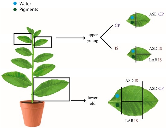 Design of the sampling and measurements in the tobacco experiment. CP—Contact probe, IS—Integrating sphere. ASD, LAB—Producers of the devices.