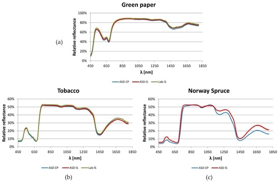 Examples of reflectance spectra of (a) coloured (green) paper and vegetation samples—(b) tobacco; (c) Norway spruce. CP—Contact probe, IS—Integrating sphere. ASD, LAB—Producers of the devices.