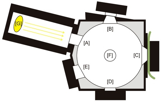 Schema of the ASD integration sphere and its ports: [A] Reflectance input; [B] Reflectance comparison; [C] Reflectance sample; [D] Transmission input; [E] Specular Exclusion Light Trap; [F] Fiber Adapter Port; [G] Collimated Light Source Assembly. The picture shows the setup of sample‘s reflectance measurement. For the white reference measurement content of the ports [B] and [C] are changed as described in the Table 3.