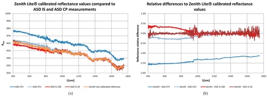 Comparison of the 95% Zenith Lite® Spectralon calibrated reflectance values (RZL) with reflectance determined by means of ASD IS and ASD CP measurements. (a) Original reflectance curves; (b) The relative differences calculated as (RZL − RASD IS/CP)/RZL.