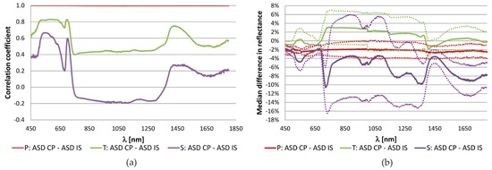 Spectral dependence of (a) the correlation coefficient and (b) the mean difference in reflectance obtained from the comparison of available samples measured with the ASD contact probe (CP) and ASD integration sphere (IS) for each wavelength in the spectral interval from 450 nm to 1800 nm. P—Coloured papers (9 samples), T—Tobacco leaves (72 samples), S—Norway spruce (96 samples). The dot lines around the median difference in reflectance show the interval of ± standard deviation.