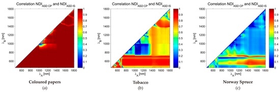 The spectral dependency of differences in the NDI is demonstrated in Figure 6. It shows examples of the correlation coefficient between the NDI values calculated for different materials from all samples and all combinations of wavelengths for the ASD CP and ASD IS. It generally confirms the increasing discrepancy between the spectra obtained by different instruments and device settings when moving from relatively homogeneous materials (i.e., coloured papers and tobacco leaves) to more complicated measurements of Norway spruce needles. The graphical results are, thus, in correspondence with statistics summarized in Table 7. Figure 6 also follows the results shown in Figure 5a. The high correlation in original spectra emanates high correlation in NDI and vice versa. The drop of correlation values around 1000 nm is caused by the spectral shift between the spectroradiometer’s sensors.