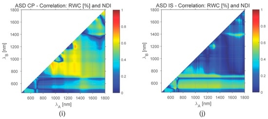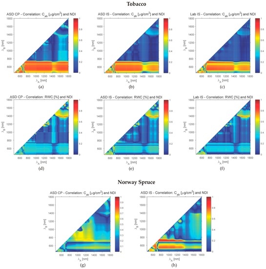 The correlation coefficients between all three leaf compounds and NDI derived for tobacco and Norway spruce samples from all available reflectance measurement were calculated. Figure 7 depicts examples of correlation between chlorophyll and NDI, RWC and NDI (the relations of NDI to carotenoids are not presented; contents of carotenoids and chlorophyll are highly correlated and the diagrams show almost identical patterns). In spite of differences in the correlation coefficient values, the diagrams show similar trends for all three devices in the case of tobacco. The NDI derived from the ASD IS measurements of Norway spruce needles have stronger correlation to chlorophyll in the combination of spectral ranges 700–1400 nm and 550–750 nm in comparison to the NDI derived from ASD CP. The correlation to water content is in general low for both types of vegetation samples with a narrow peak region at 1500–1800 nm and around 1400 nm (water absorption band). A detailed study of local maxima in Figure 7 could provide a base for proposing spectral indices sensitive to leaf compounds. Our study did not aim at such analysis; higher variability in samples would be necessary for derivation and validation of such indices.