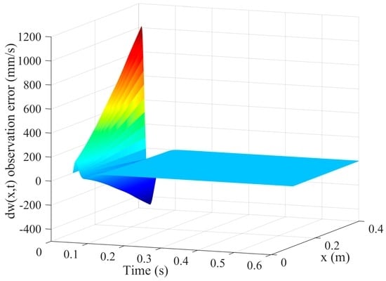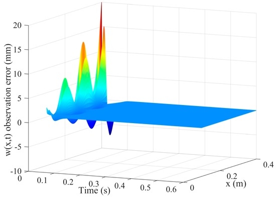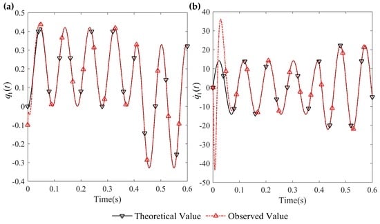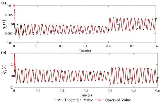In this section, a simulation is employed to analyze the observation effect of the vibration observer for the elastic modes of the TFM. The material properties are defined as follows: L = 400 mm, ρ = 2.03 × 10−3 g/mm3, A = 135 mm2, and E = 25 GPa. As indicated in [27], only the first several low-order modes play a major role in the vibrations of the flexible manipulator. Thus, in order to simplify the analysis process, the first-order and second-order modes are given consideration. The total simulation time is 0.6 s and the simulation step is 0.001 s. The motion of the base is defined as a constant acceleration when t = 0–0.4 s and a constant speed when t = 0.4–0.6 s. The observer gains are set to and .