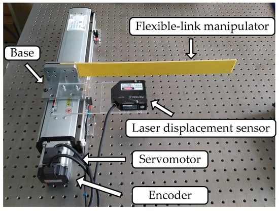 Then, Figure 7 illustrates a photograph of the experimental device for the translational flexible-link manipulator. An epoxy resin plate of 400 mm length, 40 mm width, and 3 mm thickness is seen as a flexible-link manipulator whose vibration displacement is measured by a laser displacement sensor (KEYENCE: LK-G30, Osaka, Honshu, Japan) and the repetitive precision is 0.05 × 10−3 mm. The base of the flexible-link manipulator system is driven by a permanent magnet synchronous AC servomotor (Panasonic: NO. MSMJ022G1U, Osaka, Honshu, Japan) through a ball screw. The displacement of the base is transformed from the motor angle, which is measured by its rotary incremental encoder and the resolution of the encoder is 220. The motion of the servomotor is controlled by a motion control card (GOOGOLTECH: NO: GT-400-SV-PCI, Hong Kong, China). The base motion is set as a point-to-point movement and the speed curve is set as a trapezoidal curve. The specific motion parameters of the base are as follows: the displacement is 200 mm, the maximum velocity is 100 mm/s, and the acceleration is 500 mm/s2.
