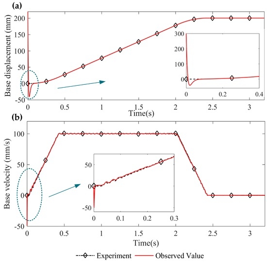 Figure 8 shows the tracking effect of the base displacement and velocity by the designed speed observer. It can be seen that the speed observer can accurately track the base displacement and velocity under the movement of constant acceleration, constant speed, and constant deceleration. The tracking speed of the base displacement is high and the observation deviation of the base velocity can be eliminated rapidly.