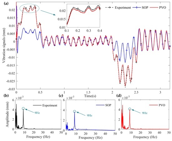Tracking effect of the vibration signals (x = 150 mm): (a) tracking effect in time domain; (b) amplitude spectra of the experiment results; (c) amplitude spectra of the SOP; and (d) amplitude spectra of the PVO.