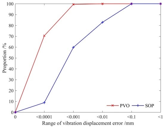 Figure 10 shows the statistical investigation and analysis of the vibration displacement errors for the vibration signals (x = 150 mm). The PVO method has 70.51% sampling points with less than 0.0001 mm vibration displacement errors and 99.40% sampling points with less than 0.001 mm vibration displacement errors, while the proportions of the SOP method are, respectively, 8.87% and 59.76% at the corresponding vibration displacement errors. Table 1 lists the performance comparison among PVO and SOP techniques. The proposed vibration observer can effectively reduce the mean and variance values of the observation error. It is observed that the effect of the proposed vibration observer is much better.
