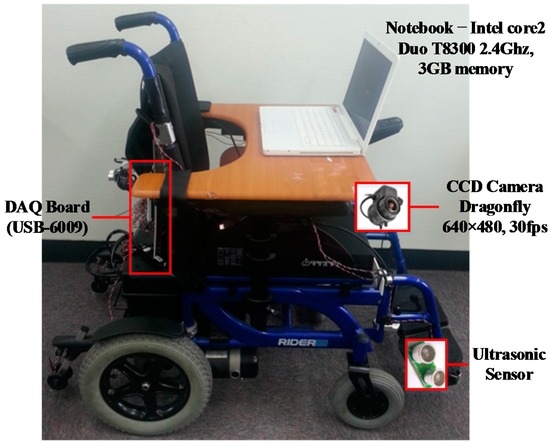 Figure 1 depicts the architecture of the proposed IW system, which consists of a general EPW, a charge-coupled device (CCD) camera, eight ultrasonic sensors, a notebook, and a data acquisition (DAQ) board. By processing the image streaming acquired from the CCD camera, the user can recognize upcoming obstacles and the type of place, thus preventing collisions with diverse obstacles, including walls, pedestrians, and moving vehicles at traffic intersections.