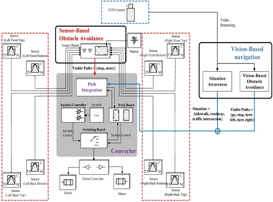 Figure 2 presents the flowchart that demonstrates how the sensor values are processed and conveyed to the user (or wheelchair). The proposed IW is made up of four modules: sensor-based obstacle avoidance, vision-based obstacle avoidance, situation recognition, and converter. While a wheelchair user is moving, the proposed wheelchair system detects diverse obstacles and determines a path to evade them. In order to achieve this, a hybrid navigation system is employed using both range sensors and a CCD camera. Most obstacles and dangerous situations are detected using vision-based navigation: obstacles of various types are discriminated using a background color model that is continuously updated via online learning, and the viable paths used to avoid collisions with the detected obstacles are determined using the learning-based classifiers. Furthermore, in order to prevent collisions with vehicles at traffic intersections, the situation recognition module determines if the user’s location is at an intersection or on a sidewalk. Then, in order to process a blind area that cannot be covered by the CCD camera, the IW uses eight range sensors that are attached to the foot tray and the corners of the IW. The processed results are conveyed to the converter, which decides the most suitable paths, and delivers it to the user or directly controls the wheelchair.