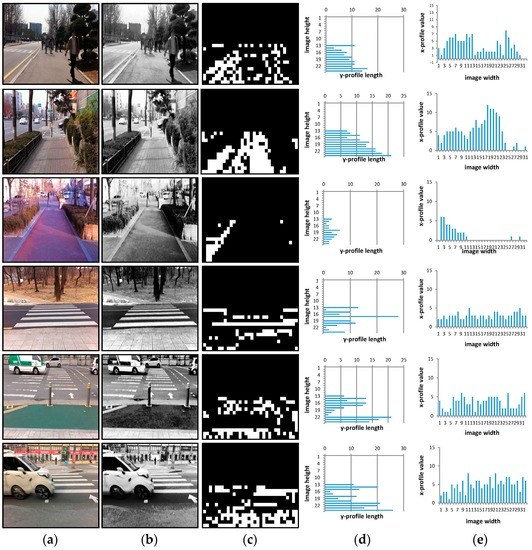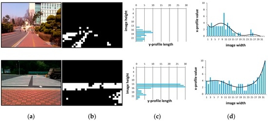 Figure 3 depicts the process of situation recognition. Figure 3a,b show the input image and the texture classification result, respectively. As shown in Figure 3b, most blocks are correctly classified into boundary and non-boundary classes. According to the classification results, the current situation is determined. Figure 3c,d are the y-axis projection profile of a binarized image and the x-axis projection profile, respectively. As seen in Figure 3c, the first-row image has a vertical histogram with a larger variance; therefore, its situational class is regarded as a sidewalk. In contrast, in the second-row image, some values on the horizontal histogram are larger than the threshold, so its situational class is understood to be an intersection.