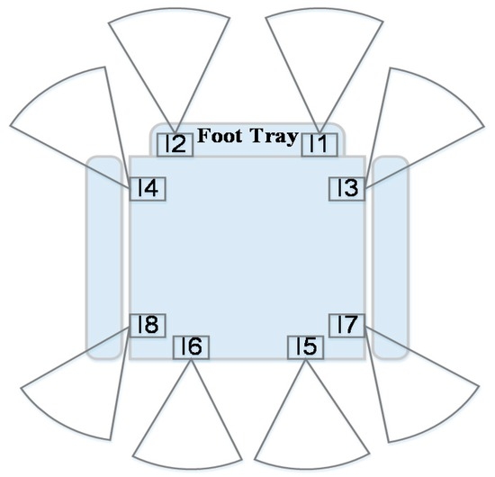 Figure 5 describes the positions of the sensors attached to the proposed IW system, all of which have a maximum range of 2 m and a minimum range of 1.03 cm. Through processing the information measured from sensors, the method categorizes the current paths into “move” and “stop”, and it is primarily employed to recognize stairs and obstacles coming from behind the wheelchair.