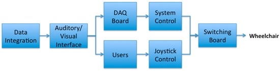 As seen in Figure 2, the converter is composed of a DAQ board, a joystick controller, and a switching board. Through the switching board, the user can select the control type, which is determined by the user’s need, e.g., disability, age, etc. If the user has a severe cognitive impairment or motor impairment, the system control is chosen; otherwise, the joystick control is adopted in order for the user to directly control the wheelchair while taking the paths suggested by the navigation system. This mechanism is illustrated in Figure 6.