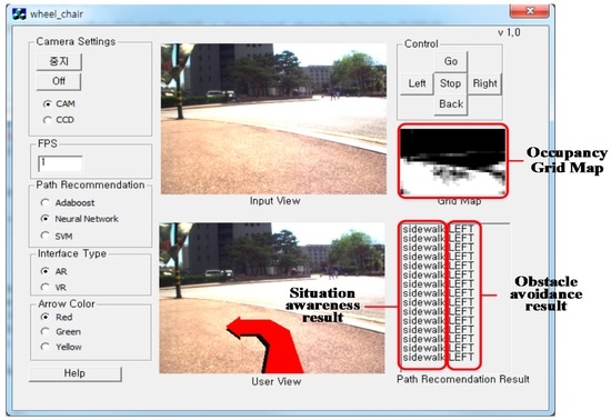 In order to aid user understanding, a graphical user interface is provided and is depicted in Figure 7. With the proposed interface, the user can more efficiently control the wheelchair. All recognition results, i.e., the viable paths and current situations, are displayed on the laptop computer’s screen. In particular, the viable path is overlaid on the real-time image, so the user can direct the wheelchair along the viable path more effectively.