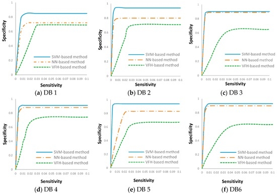 As depicted in Figure 9, the ROC curves clearly exhibited differences among the three methods. Among the three methods, the SVM-based method exhibited the fastest convergence speed as well as the highest accuracy. Although there were some differences according to the environments, the SVM-based classifier converged to approximately 99.5% sensitivity and 90.0% specificity regardless of the environments, and the NN-based method converged to almost 98.4% sensitivity and 90.0% specificity. In contrast, the VFH-based method gradually converged to 96.0% sensitivity and a specificity between 60.0% and 70.0%.