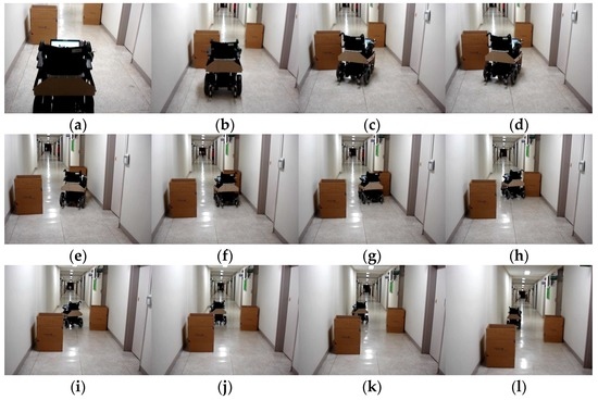 Autonomous wheelchair operation results by system control: (a) experimental setup; and (b–l) show the navigation results by autonomous IW control.