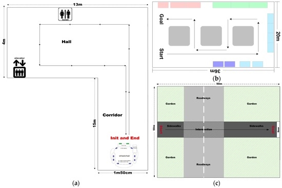 In the literature, experiments were mostly performed in constrained laboratory environments, which do not accurately represent the real-life situations that people with impairments face in their daily lives. Therefore, we performed the field tests both indoors and outdoors. All the environments contained many kinds of fixed obstacles with different structural and material characteristics—chairs, fire extinguishers, narrow doorways, walls, and trees—and non-fixed obstacles (moving people or vehicles, etc.). The maps are depicted in Figure 12, which is composed of two indoor environments and one outdoor environment.