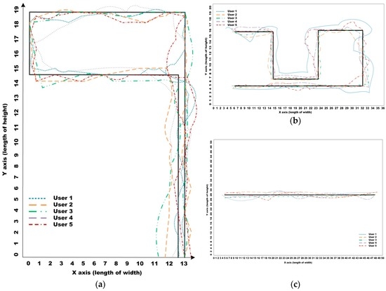 Users’ trajectories in the respective test maps: (a–c) users’ trajectories in the test maps shown in Figure 12.