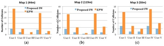 Number of collisions for the respective participants to accomplish the respective goals using a general EPW and the proposed IW navigation algorithm: (a) Result for 1st map; (b) result for 2nd map; and (c) result for 3rd map.