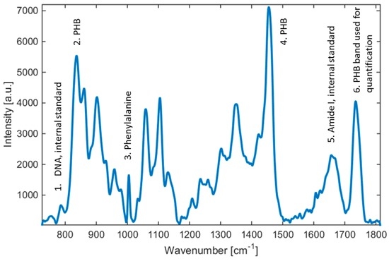 Raman spectra of Cupriavidus necator H16. Selected emission lines used in our study are highlighted. Note that peaks 1, 5, and 6 can be used for analysis of PHB in the bacteria sample—peak 6 represents the PHB band used in this study, peak 5 is an internal standard (Amide I), and peak 1 is a second internal standard (DNA).