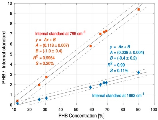 It should be noted that the calibration curves are limited only for the amorphous state of the polymer found inside the cells. We noticed that only in a few cases (most likely depending on incorrect treatment of cells before analysis) could the amorphous state be changed such that crystallization appears as a great enhancement of intensity or shift of PHB-corresponding Raman peaks [26]. This can be favorably solved—the qualitative difference between crystalline and amorphous polymer states can be evaluated by simply monitoring the position of the PHB line of interest (peak 6 in Figure 1) within the spectra. In the case of crystallization, this band may vary up to 15 cm−1 (from 1736 cm−1 to about 1721 cm−1) in the Raman spectra of bacteria, which is a clear sign that the crystallization will occur and can be readily controlled by the naked eye.