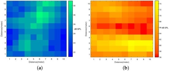 We put only one speaker in the underground parking lot environment and then let the speaker broadcast a high frequency acoustic signal along with or without the common music. We also set L = 5 m, 10 m, 20 m, 30 m, and . In Figure 12a, we can detect that when 20 m, the VUCA system is stable for the acoustic source transmitting both single and multiple acoustic signals. When L > 20 m, the results have been affected.