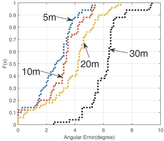 We gather the mean angular errors of all the experiments. Then, we plot the CDF of the angular error in the noisy environment in Figure 12b. The results of experiments show that almost all errors are less than 12 degrees for , which is acceptable for daily use.