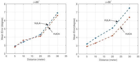 In this section, we test the angular errors when the speaker and the smartphone are not at the same height. We set L = 8 m, and and . To vary different elevation angles, we fix the speakers on different heights of the pillars in the parking lot. We can find the different performances of the VULA system and the VUCA system in different scenarios in Figure 10a. We detect that the VULA is affected when the elevation angle θ grows. On the other hand, the VUCA’s accuracy remains almost the same as different elevation angles. We believe the main reason for these results is that the signal model of the VULA system is two-dimensional, while the signal model of the VUCA system is three-dimensional. In other words, only the VUCA system takes the elevation angle of the target signals θ into consideration. In addition, the VUCA system has another advantage that it can also calculate the specific value of elevation angle θ by the UCA-RB-MUSIC algorithm. For example, it helps us to determine whether the anchor points are on the same floor with us or not in a big shopping plaza. This characteristic can bring more productive experiences to the user.