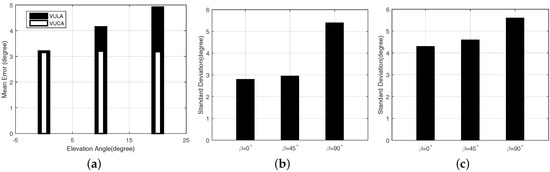 (a) mean error of VULA and VUCA when and L = 8 m; (b) standard deviations of angular error when 6 m; and (c) standard deviations of angular error when L = 24 m.