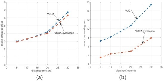 (a) mean errors of the VUCA system and the VUCA-gyroscope system with different distance and stable motion patterns; and (b) mean errors of the VUCA system and the VUCA-gyroscope system with different distance and unstable motion patterns.