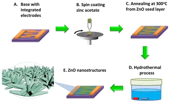 With the increasing performance of nanotechnology-based chemosensors, various nano-materials, including nanotubes, nanowires, and nanorods, have been investigated for the detection of volatile organic compounds (VOCs). The nanoscale size of these nanomaterials provides excellent chemical, optical, and electrical properties, such as a large surface-area-to-volume ratio. This results in more active sites, an increase in sensitivity, and a lowering of response/recovery times [5]. Among the various methods of nanomaterial synthesis, the hydrothermal synthesis process is highlighted because of its advantages in controllable parameters, low processing temperature, and low cost, and also because it is a possible substitute for flat-plate coating.