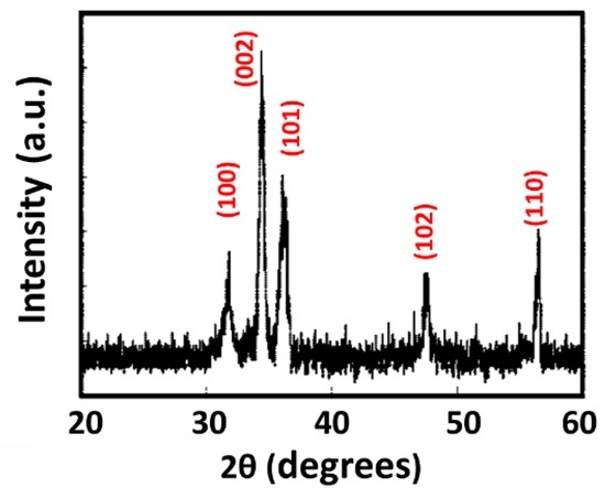 ZnO is an important semiconductor material with a wide and direct band gap (Eg = 3.37 eV). It has been widely used with high sensitivity for the detection of various gases [20,21,22,23,24,25,26]. It is also suitable for the synthesis of nanomaterials and has a broad UV absorbing spectrum.