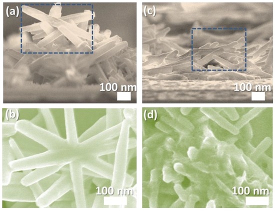 The measurements of thicknesses were collected from two independent batches using an image analysis software (ImageJ, Bethesda, MD, USA) in SEM analysis. The diameter of both nanowires is approximately 60 nm. Figure 4c shows that the ZnO nanowires form a bridge conformation on the ZnO films. Figure 4b,d show top-view SEM images which were enlarged from the rectangular areas in Figure 4a,c.