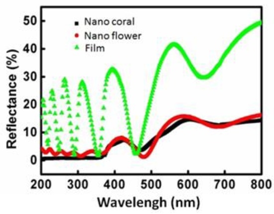 Figure 5 shows spectra of specular reflectance measured on the three detectors with different surface conditions: with a ZnO thin-film layer (100 nm), with flower-like ZnO, and with coral-like ZnO. The spectra were obtained at an incidence angle of 5° and the wavelengths ranged from 300 nm to 800 nm. The ZnO layer has an effective refractive index of approximately 2.02 and an extinction coefficient of nearly zero [35]. The values of reflectance fluctuate because the incident waves reflect off the top surface of the interdigitated electrode. The thickness of the film is of the order of the wavelength of the incident wave, thus causing typical thin-film interference. For the devices with a ZnO nanostructure, the reflection is almost constant from 400 nm to 700 nm, but gradually decreases as the wavelength approaches the UV range close to 400 nm. From Figure 5, the addition of a nanostructure layer leads to an even lower reflectance. Unlike the reflectance oscillation observed in the device with a thin-film layer, the reflectance of the devices with the nanostructured layers stays below 5% for all the studied wavelengths, therefore exhibiting superior anti-reflectance (AR) performance. This AR characteristic increases the UV absorption efficiency of devices with nanostructured layers.