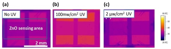 In order to measure the operating temperature of the UV photoactivated detector, an IR detector, was constructed to evaluate the functionality of the proposed detectors. An IR detector was used to monitor the temperature distribution of the detector, to confirm that experimental UV illumination (2 μW/cm2) had negligible effect of temperature during testing, as shown in Figure 6. Figure 6a shows an IR image of the coral-like detector with no illumination and Figure 6b shows a control group with 100 mW/cm2 high intensity UV illumination. It can be seen that the temperature of the devices increases as a result of high-intensity (100 mW/cm2) UV illumination, as shown in Figure 6b. However, our device only requires low-intensity UV illumination (2 μW/cm2) to stimulate sufficient photo-induced oxygen ions at room temperature.