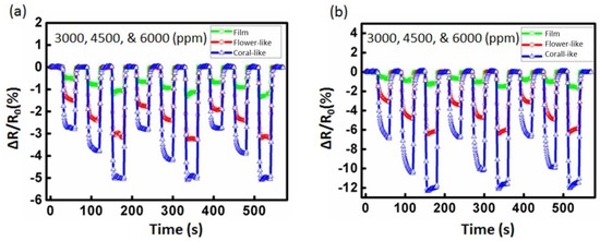 Detailed characterization results for the ZnO film and flower-like and coral-like nanostructure detectors are shown in Figure 7. For 3000, 4500, and 6000 ppm of toluene injected onto the gas detectors separately, the transient sensitivity values of the ZnO-based gas detectors to toluene with no UV illumination at room temperature are shown in Figure 7a. Before UV illumination, the film detector’s average values of sensitivity to toluene gas were 0.51% (3000 ppm), 0.76% (4500 ppm), and 1.04% (6000 ppm). The flower-like detector’s average values of sensitivity to toluene were 1.48% (3000 ppm), 2.31% (4500 ppm), and 3.13% (6000 ppm). The coral-like detector’s average sensitivity to toluene was 2.73% (3000 ppm), 4.01% (4500 ppm), and 5.27% (6000 ppm), respectively, as shown in Figure 7a. The coral-like detectors demonstrated the greatest enhancement of sensitivity, with a >500% increase (from 0.51% to 2.73% at 3000 ppm; from 0.76% to 4.01% at 4500 ppm; from 1.04% to 5.27% at 6000 ppm) compared to film detectors at room temperature.