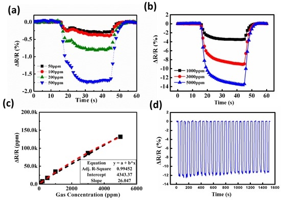 In the past decade, metal-oxide gas detectors have attracted substantial interest thanks to their low cost, flexible production, simple application, wide variety of detectable gases, and potential for integration with semiconductors or micro-electro-mechanical systems (MEMS) [1,2]. Various metal-oxide-based materials are used in gas detection because of their numerous advantages, such as high sensitivity and stability and fast response [1,2,3,4].
