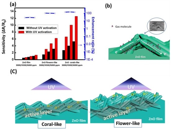 Following UV irradiation, the sensitivity of the photoactivated detector increased on the ZnO surface, particularly on coral-like surfaces. We propose a simple model to explain this. Figure 9c shows the schematic diagram of the oxygen ions generated with UV illumination on the flower- and coral-like based detectors. For flower-like based detectors, it is assumed that oxygen ions are generated mostly on the upper part of the flower-like structure. However, the flower-like detector has few oxygen ions close to the substrate. Most of the generated oxygen ions do not contribute to the reaction on the ZnO surface. The rectangle shows the effective active layer for gas sensing. Only the increased oxygen ions in the active layer contribute to the resistance change for gas sensing. More oxygen ions in the active layer result in a greater change in the resistance. The coral-like detector shows the greatest increase in oxygen ions on an active layer close to the ZnO film substrate. This results in coral-like detectors having higher sensitivity than flower-like detectors.